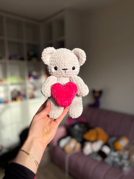 Wykonany ręcznie na szydełku; miś z serduszkiem, z włóczki Himalaya Dolphin Baby. Ma bezpieczne plastikowe oczy i jest wypchany hipoalergiczną kulką silikonową